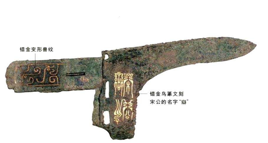 春秋时期兵器,全长22.3厘米,一九三六年安徽省寿县出土。此戈有铭文,为错金鸟篆体。宋公栾即宋国国君宋景公,周敬王四年(公元前5l6年)即位,卒于周贞定王十八年(公元前451年)。宋国为子姓,开国之君是商纣王的庶兄微子启。公元前11世纪,周公平定武庚的叛乱后,把商的旧都周围地区分封给微,建都商丘(今河南省商丘南),有今河南东部和山东、江苏、安徽部分地区。春秋时宋襄公曾企图称霸,未成,此后国势衰弱。公元前4世纪中叶,司城子罕逐杀宋桓侯,夺得政权。公元前286年为齐国所灭。
