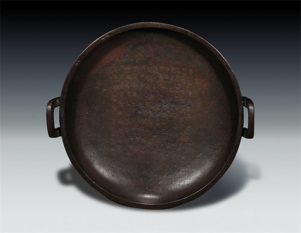 兮甲盘是一只内底趋平的圆盘,皮壳黑亮,盘沿下方绘有窃曲纹,两侧有附耳,盘底刻有133字的铭文,讲述西周宣王时期,重臣兮甲吉甫遵王令,讨伐严允(原作玁狁)、掌政成周(即洛阳)之事。这段铭文时间、地点、人物、事件四要素齐备,对研究西周宣王时期官制、战争、封赏、税赋、奴隶、贸易管理等均具有重要意义。
