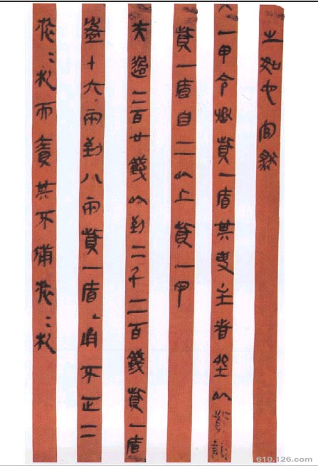 在纸张发明以前,中国古代书写材料除少数纺织品外,主要是简牍。一般为竹、木片。1975年发掘出上的湖北《云梦睡虎地秦简》,成书于战国晚期至秦统一初期。从简中可以看出其脱胎于秦篆,形体中仍保存有大量的母体痕迹,篆隶混杂,秦隶在破坏、肢解秦篆的书写方式中,欹斜相依,肥瘦相间,节奏鲜明平稳,笔划饱满生动,气势连贯,形成质朴而秀朗的书风,尽管仍留有大量的篆书圆笔中锋的笔法,但比《青川木牍》隶化的特征更为明显。汉代隶书中的掠笔、波挑、不同形态点的笔法等在简中都已出现,部分简上还有明显的连笔意识。与石刻文字相比,此简更直接体现了毛笔运动的丰富性。《云梦睡虎地秦简》是研究隶书起源和发展的重要资料。从《青川木牍》——《天水放马滩秦简》——《云梦睡虎地秦简》之间我们可以清晰看到秦篆至古隶的演变过程。