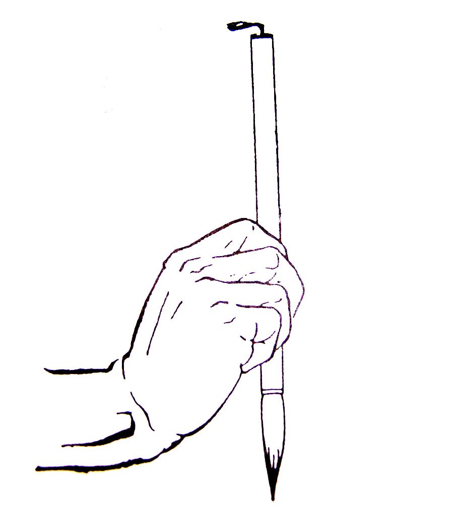 指实,用指尖捏笔,不能用指关节处勾笔。因指尖部分感觉灵敏,易于控制笔锋的细微变化。手指捏笔要松紧适度。一般地说,所写的字越小,笔就越要捏紧一点,大字则可松一些。坐书姿势捏笔要紧一些,立书姿势则可松一点。
