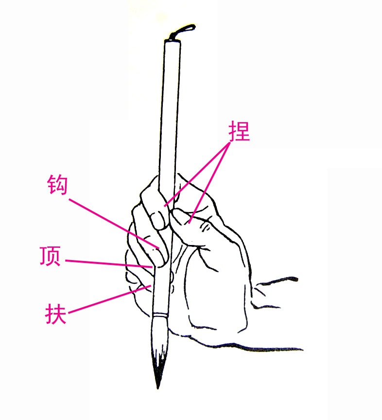 其实不必拘泥以上的“五字”这个形式,笔者觉得现在用“捏钩顶扶”四字执笔法更通俗,更容易被初学者接受,下面也简单介绍一下,供大家参考。