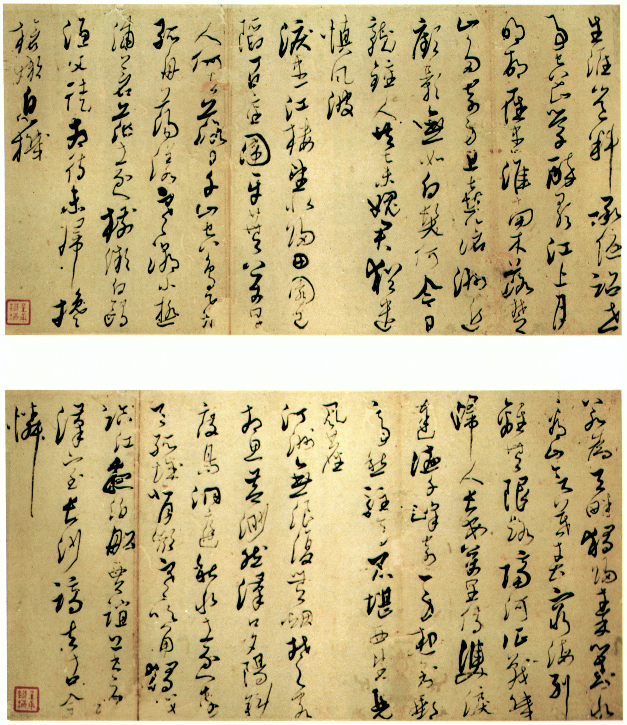 释文:生涯岂料承优诏,世事空知学醉歌。江上月明胡雁尽,淮南木落楚山多。 寄身且喜沧洲近,顾影无如白发何!今日龙钟人共弃,愧君犹遣慎风波。