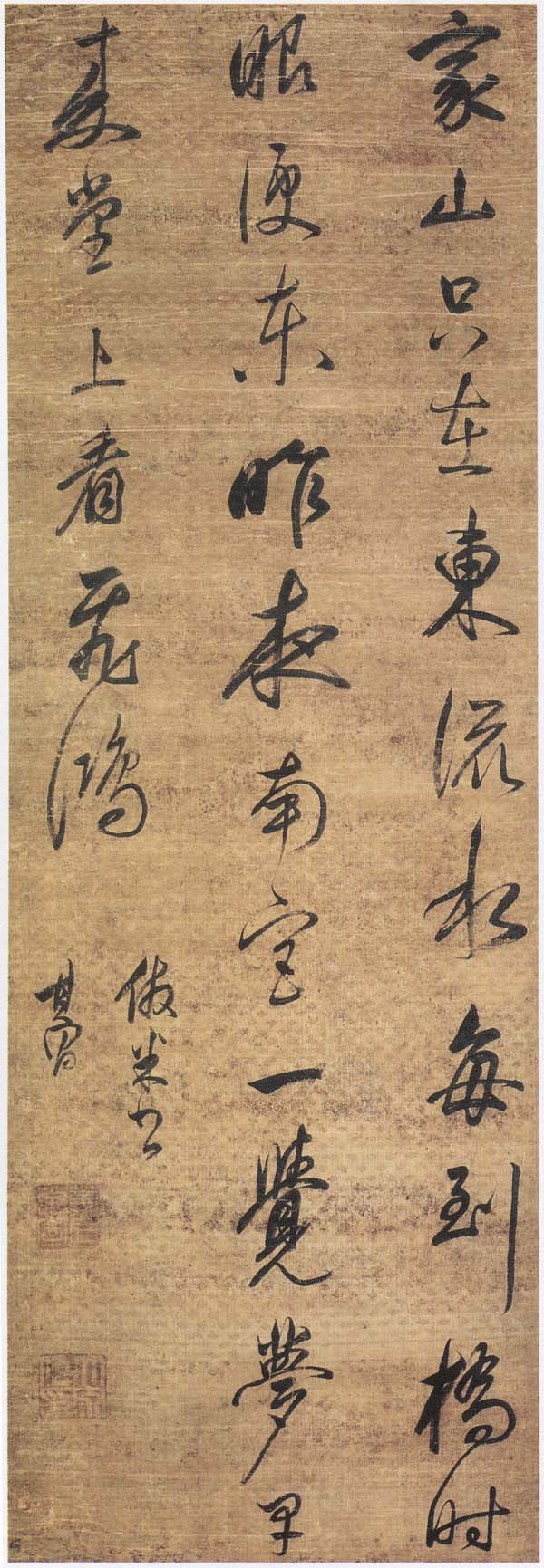 董其昌《仿米书诗轴》 南通博物苑藏 杭州书法高考培训班 2016-09-29 20:10 1,772 views 人阅读 0 条评论 董其昌《仿米书诗轴》 南通博物苑藏 董其昌《仿米书诗轴》 南通博物苑藏 释文:家山只在东流水,每到桥时眼便东。昨夜南宫一觉梦,早来堂上看飞鸿。 款识:仿米书。董其昌。 【资料来源】《南通博物苑文物精华》(文物出版社) 中国美院硕士开设的书法高考培训班(有需要了解的扫码加微信) 本文地址:http://shufa.yiriyitiao.cn/466.html 版权声明:本文为网友投稿发布,版权归原作者所有。本站小编: 杭州书法培训班 编辑。欢迎分享本文,转载请保留出处! 0人喜欢 分享: PREVIOUS:陈继儒《行书阿含经句轴》 南通博物苑藏 NEXT:来楚生《录黄庭坚句七言联》纸本行书 上海童衍方藏 文章导航