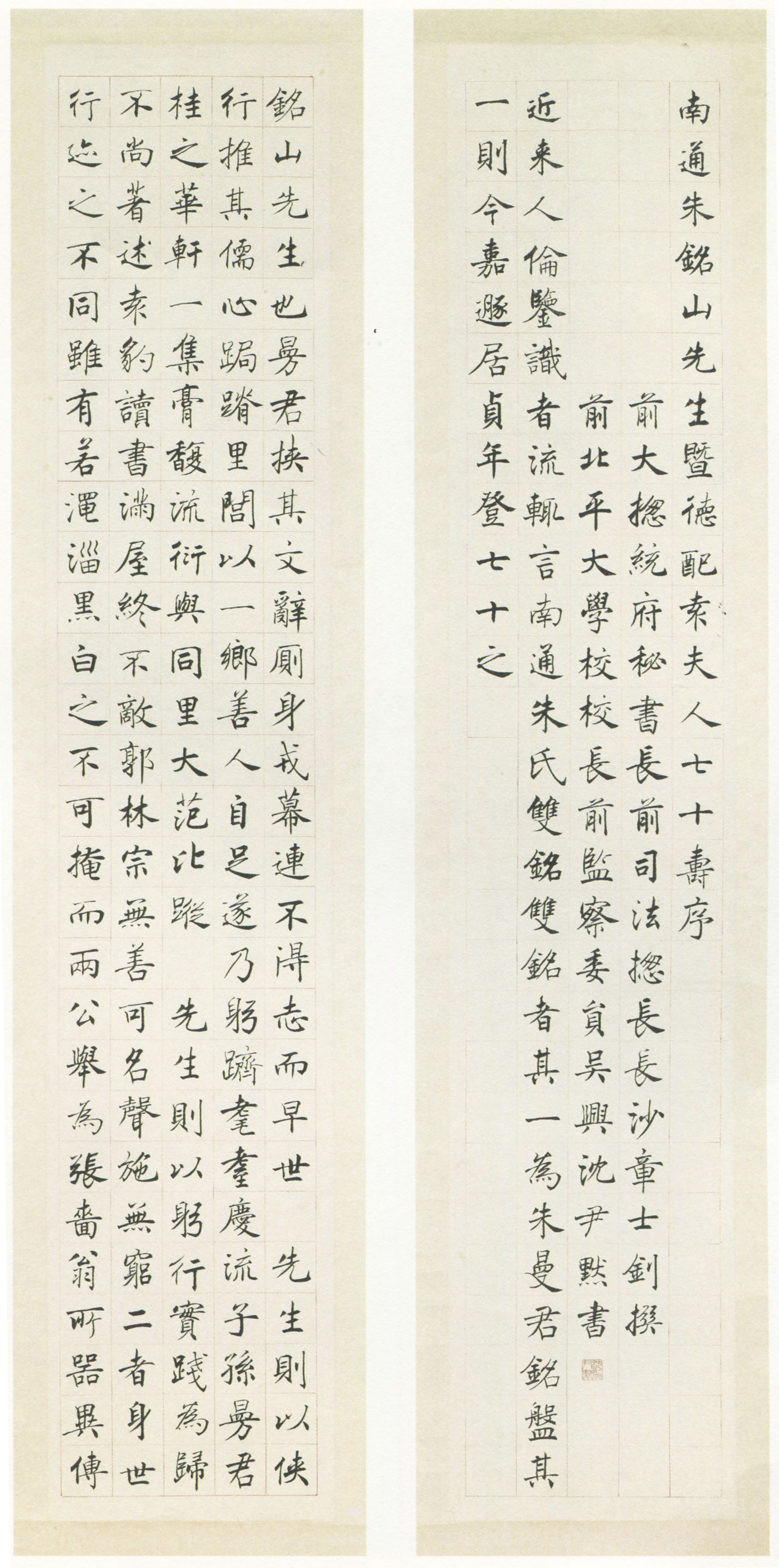 此作以沈尹默最拿手的细笔楷书书写,是沈尹默现存尺幅最大的书法作品。值得一提的是,这件作品书写于1947年,是当时学界、政界联合送给南通朱铭山的贺寿序言,最后四条中的落款,沈尹默书写了邵力子、胡适等一百多位名人名家的名字,几乎涉及了当时学界、政界的“半壁江山”。