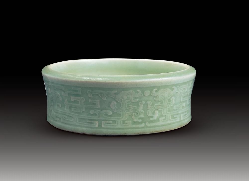 笔洗的形制以钵盂为其基本形,其他的还有长方洗、玉环洗等。笔洗的材质以陶瓷最为常见,有官、哥元洗,葵花洗,罄口圆肚洗,四卷荷叶洗,卷口帘段洗,缝环洗等。其中以粉青纹片朗者为贵,如,龙泉双鱼洗,菊花瓣洗、百折洗、定窑三箍元洗、梅花洗、绦环洗、方池洗耳恭听、柳斗元洗、圆口仪棱洗等。今藏于上海博物馆的哥窑海棠式洗、藏于台北故宫博物院的枢府釉印花洗都是国宝级的稀世珍品。此外,还有中间用作笔洗,边盘用作笔掭的。可见,笔洗的形制各异,或素或花,工巧拟古,虽在文房用具中不占有主导地位,但集一套不同性质的笔于书案前也蔚为奇观洗。