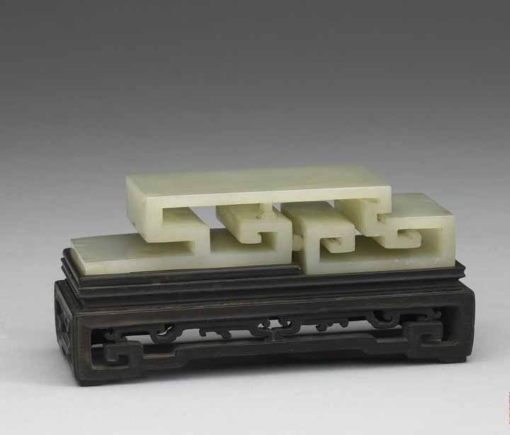 说明:青玉,玉色泛黄,器身有璺。全器作变化式回纹,平顶式可放置墨锭。附木座,作长方形,於座面上鏤雕四瓣花与叶。