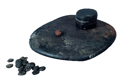 砚体扁薄略呈圆角方形,为天然鹅卵石制成。附圆柱形研石,直径3.2厘米,高2.2厘米,中间有切割痕两道。砚面及砚石均残留朱、墨痕迹。同出尚有大小不一墨丸数粒。