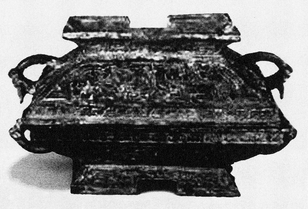 长方体,直口平沿,短颈,斜壁平底,侧壁有一对兽首鋬,方圈足外撇,中部有长方形缺,盖与器形制相同。腹饰回顾式龙纹, 口沿饰连续式卷龙纹,足饰爬行饰长体龙纹,盖的前后壁龙纹中间以小鸟,盖顶和器外底饰兽纹。盖与器铭文一致,各26字。