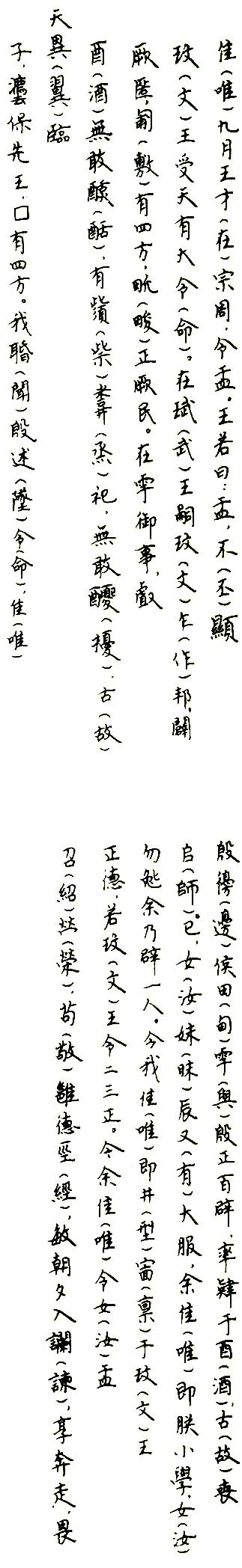 九月王在宗周册命盂。王这样说:"伟大英明的文王承受了上天佑助的重大使命。到了武王,继承文王建立了周国。排除了那个奸恶,普遍地保有了四方土地,长久地治理着百姓。办事的人在举行饮酒礼的仪式上,没人敢喝醉,在举行柴、烝一类的祭祀上也不敢醉酒。所以天帝以慈爱之心给以庇护,大力保佑先王,广有天下。我听说殷朝丧失了上天所赐予的大命,是因为殷朝从远方诸侯到朝廷内的大小官员,都经常酗酒,所以丧失了天下。你年幼时就继承了先辈的显要职位,我曾让你就读于我的贵胄小学,你不能背离我,而要辅佐我。现在我要效法文王的政令和德行,犹如文王一样任命两三个执政大臣来任命你,你要恭敬地协调纲纪,勤勉地早晚入谏,进行祭祀,奔走于王事,敬畏上天的威严。"王说:"命你盂,一定要效法你的先祖南公,"王说:"盂,你要辅助我主管军队,勤勉而及时地处理赏罚狱讼案件,从早到晚都应辅佐我治理四方,协助我遵行先王的制度治民治疆土。赏赐给你一卣香酒、头巾、蔽膝、木底鞋、车、马;赐给你先祖南公的旗帜,用以巡狩,赐给你邦国的官员四名,人众自驭手至庶人六百五十九人;"赐给你异族的王臣十三名,夷众一千零五十人,要尽量让这些人在他们所耕作的土地上努力劳动。"王说:"盂,你要恭谨地对待你的职事,不得违抗我的命令。"盂颂扬王的美德,制作了纪念先祖南公的宝鼎,时在康王在位第二十三年。(