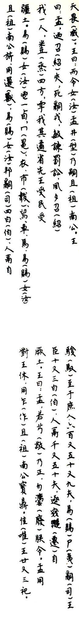 铭文:隹(唯)九月王才玟王受天有厥匿匍有四宗周令盂王大令在珷王方畯正厥民若曰盂不显嗣玟乍邦辟在{雨于}御事虘又酉无敢酉舌有子灋保先王殷边侯田{雨于} {此须}□(烝)祀无敢□有四方我殷正百辟率酉夔古天异临耳昏殷述令隹肄于酉古丧巠敏朝夕入令女盂井乃谰享奔走畏嗣且南公王曰盂廴西召夹我一人{米豆}四方疆土易女鬯死□戎敏谏{雨于}我其遹省一卤冖衣巿罚讼夙夕召先王受民受舃车马易女且南公旂用□(驭)至于庶人臣十又三白辶兽易女邦□六百又五十又九人鬲千又五十四白人鬲自夫易尸□王夫<辶亟>□迁(迁)自厥土王曰盂对王休用乍若□(敬)乃正勿且南公宝鼎灋朕令盂用隹(唯)王廿又三祀