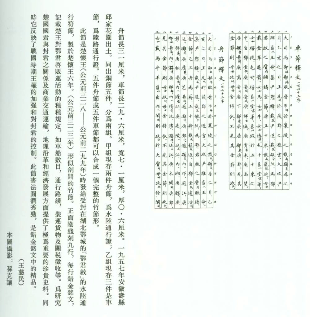 节是水陆交通运输凭证,相当于现在的交通运输通行证。《鄂君启节》于1957年4月在安徽省寿县城南邱家花园出土,分为舟节和车节两种,是战国中期楚国器,青铜铸造。舟节(右)主要用于水路运输通行;车节(左)主要用于陆路运输通行。使用时货主与官吏各有相同的节,对核后无误才可通行。