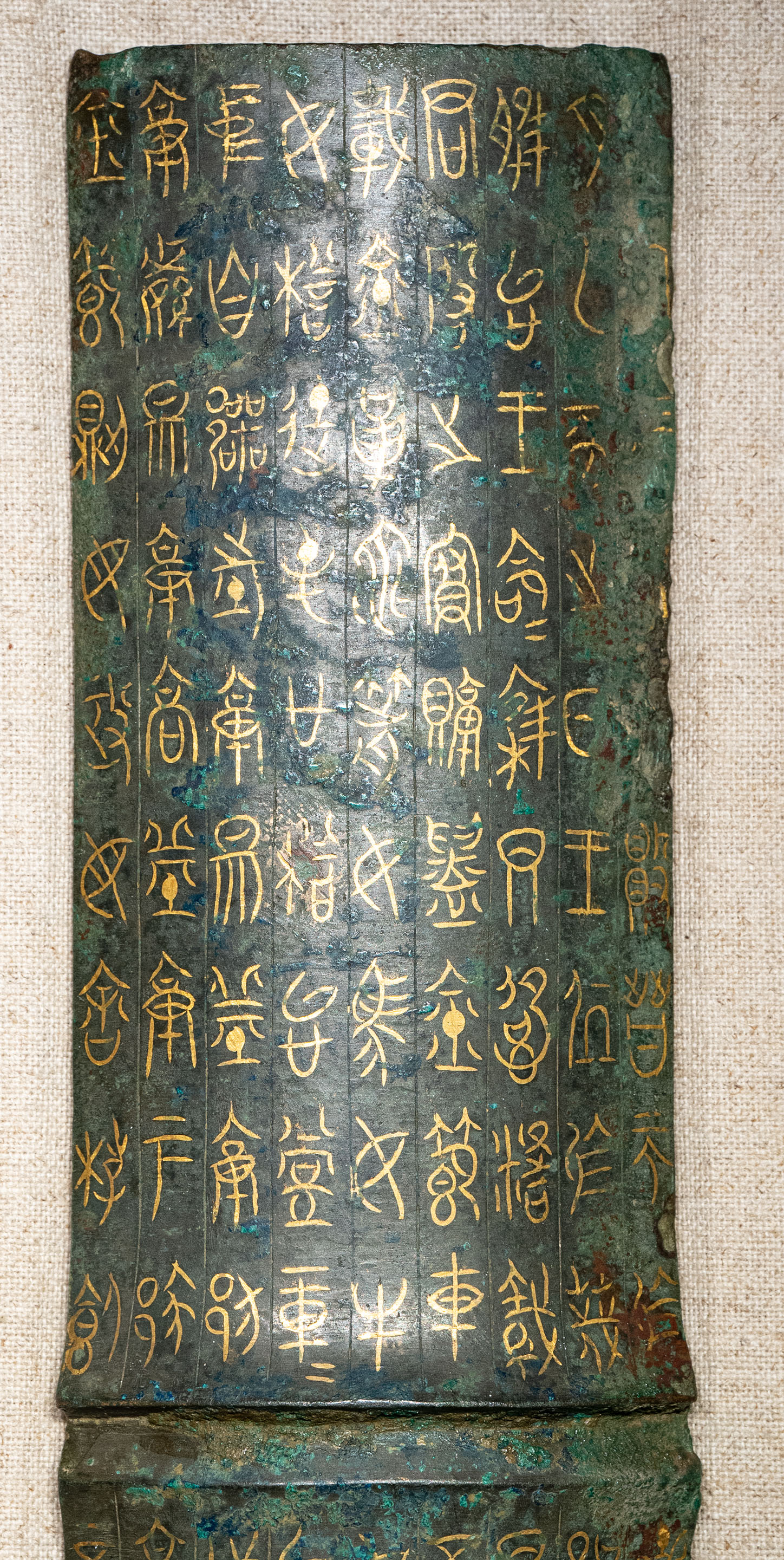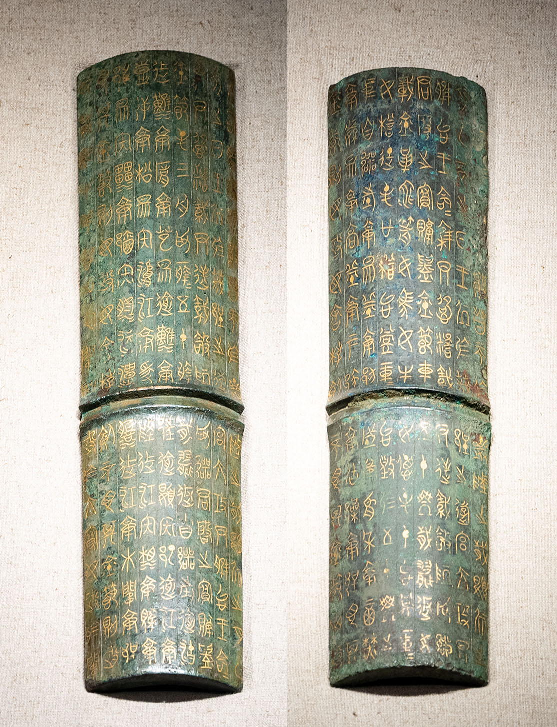 此“金节”用铜铸成,因形似劈开的竹节,故名“节”。这种“车节”和“舟节”,迄今为止仅此一见,因而极为珍贵。为防奸杜伪,在镶嵌工艺的基础上进行“错金银”再创作,故又称《错金鄂君启金节》。错金银也叫“金银错”,其方法是在青铜器铸造时铸出腰槽,将金银片、丝放入槽内,锤打后错实磨平。这一工艺是在春秋时期产生的,应用至今。《鄂君启节》铭文挺拔秀丽,圆润秀劲,庄严肃穆是错金铭文中的精品。